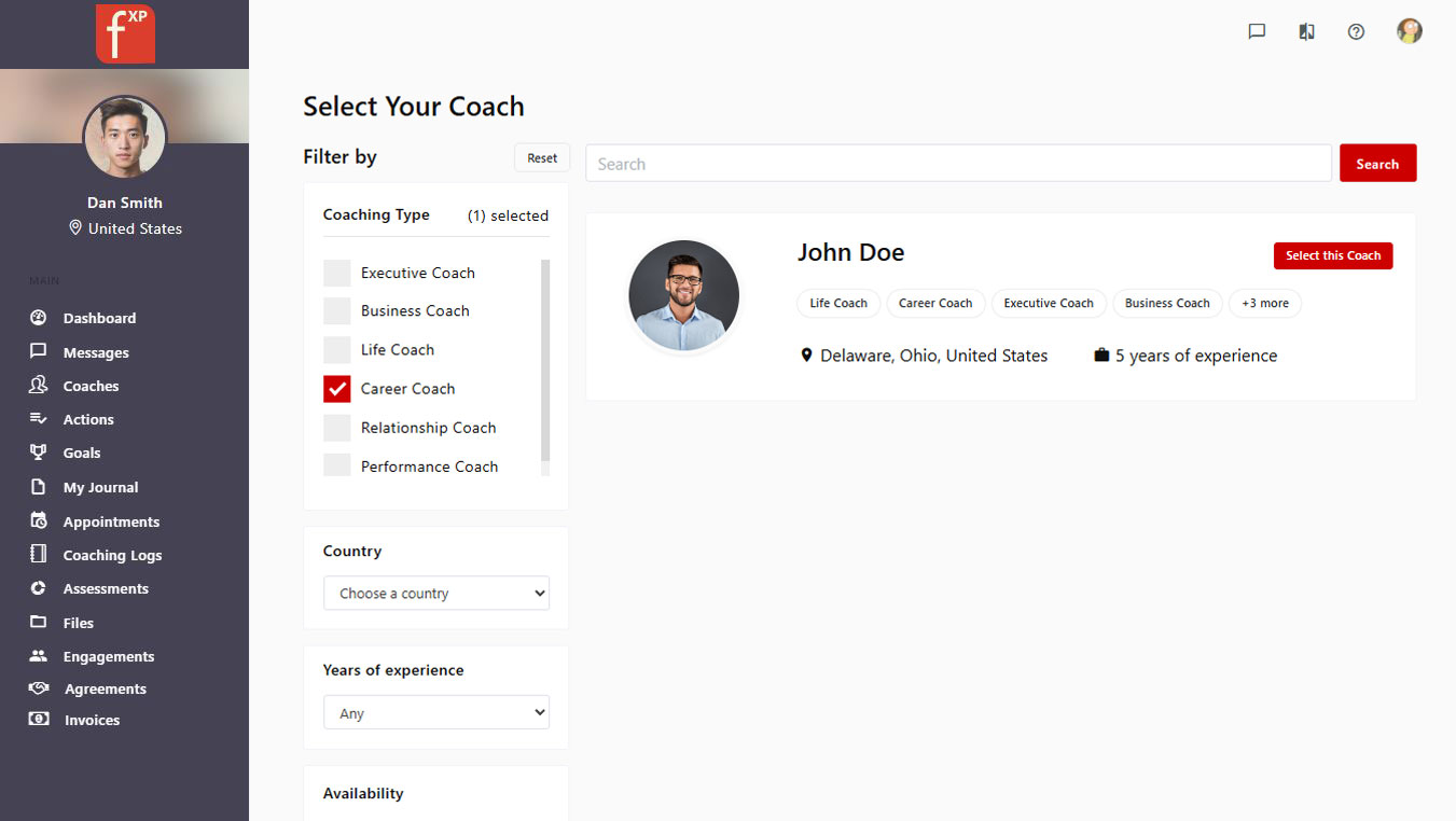 Upon clicking the "Get Started" button, users will be directed to the Coach Selector Interface. Here, they can search for a coach that suits their preferences using the built-in filters.