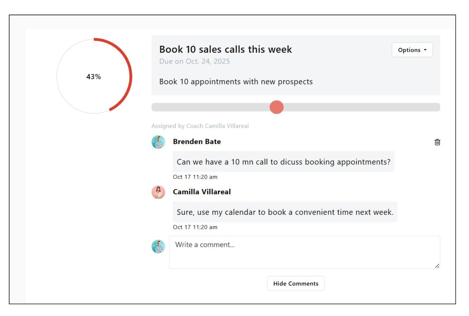 Using the comment bar for ongoing discussions helps you and your coach maintain clarity and accountability for each step of your development plan.