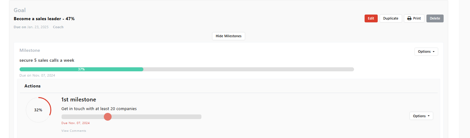 - Both you and your coach can adjust the completion percentage of each action to reflect actual progress.