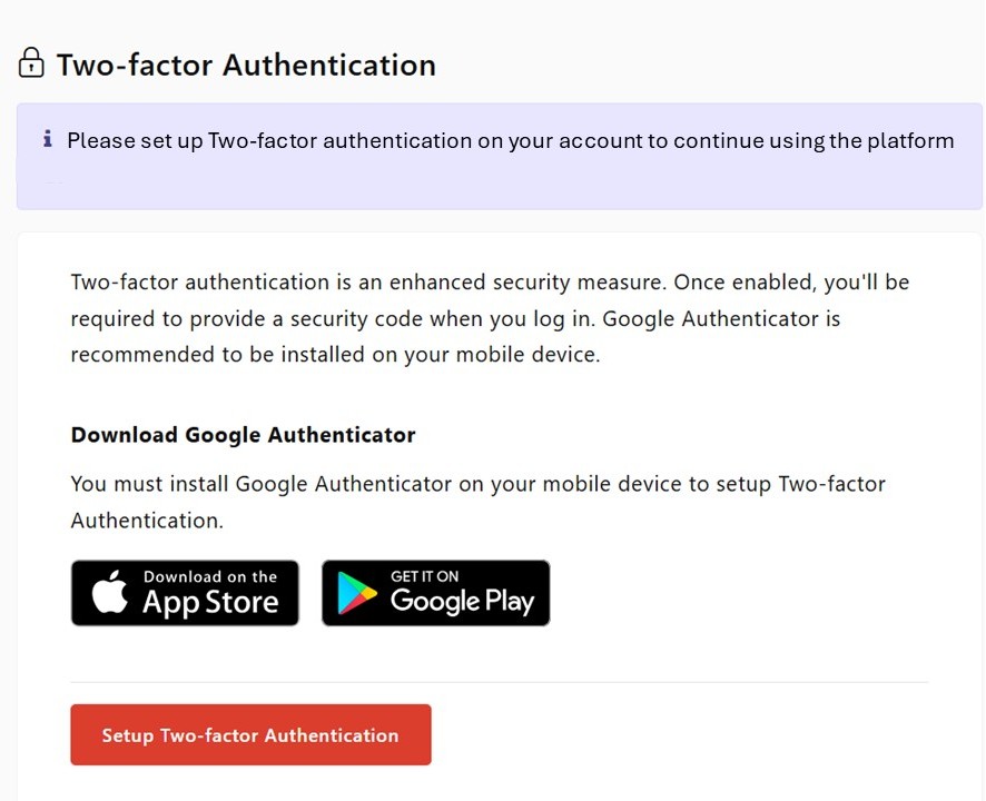 - On the 2FA setup page, click Set Up Two-Factor Authenticator.