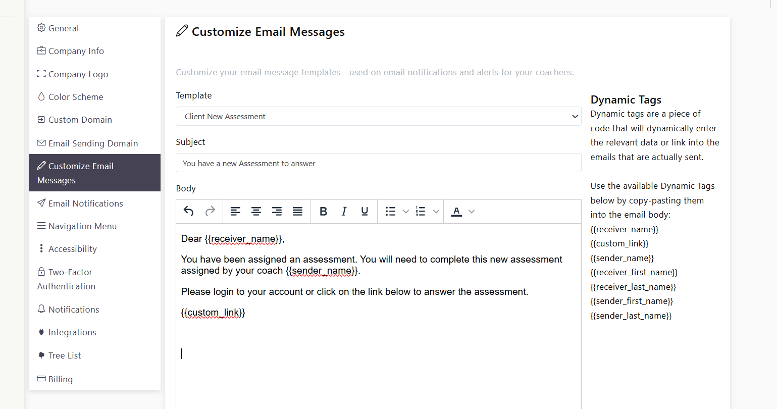 Updated Oct. 30, 2025 by SupportThe Customize Email Messages feature allows administrators to edit the subject line and body of automated emails sent from the platform.