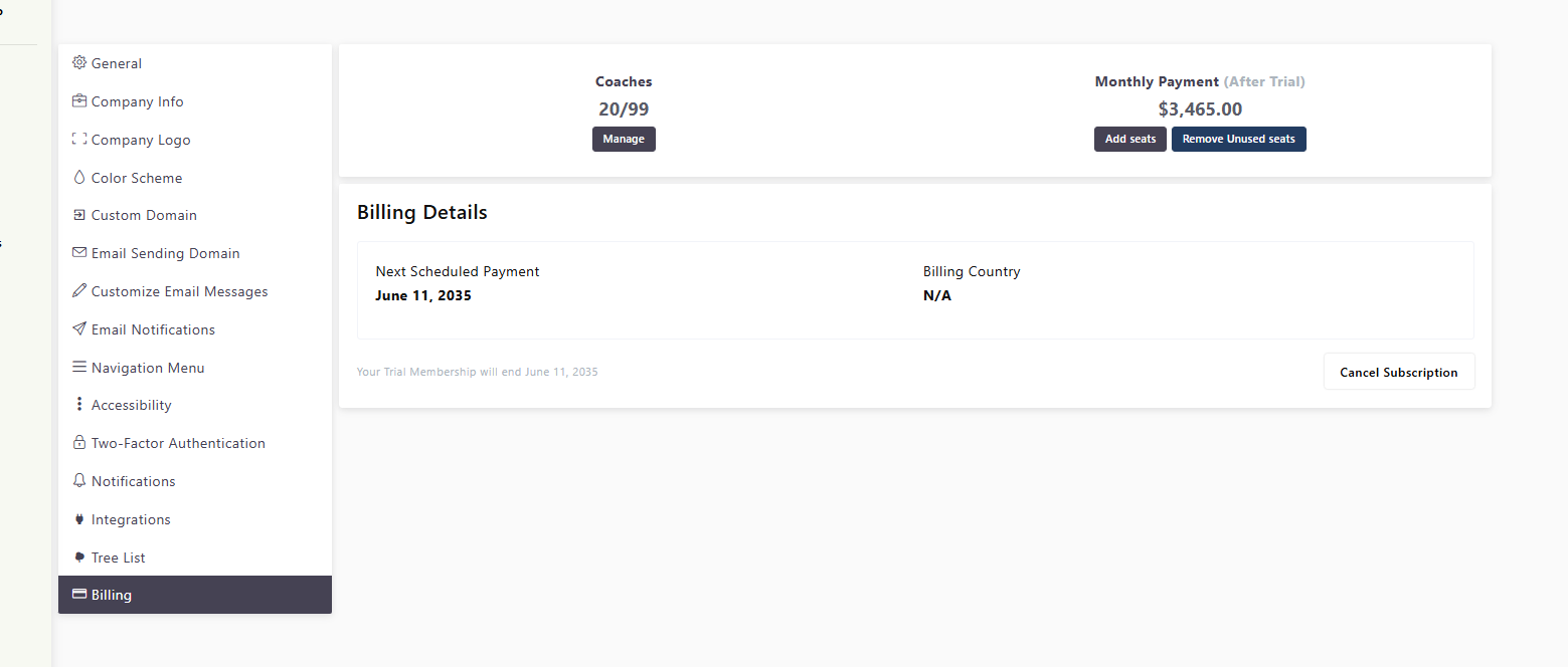 Updated Dec. 10, 2025 by SupportFrom the Billing page, administrators can manage coach seats, review upcoming payments, and track payment history.