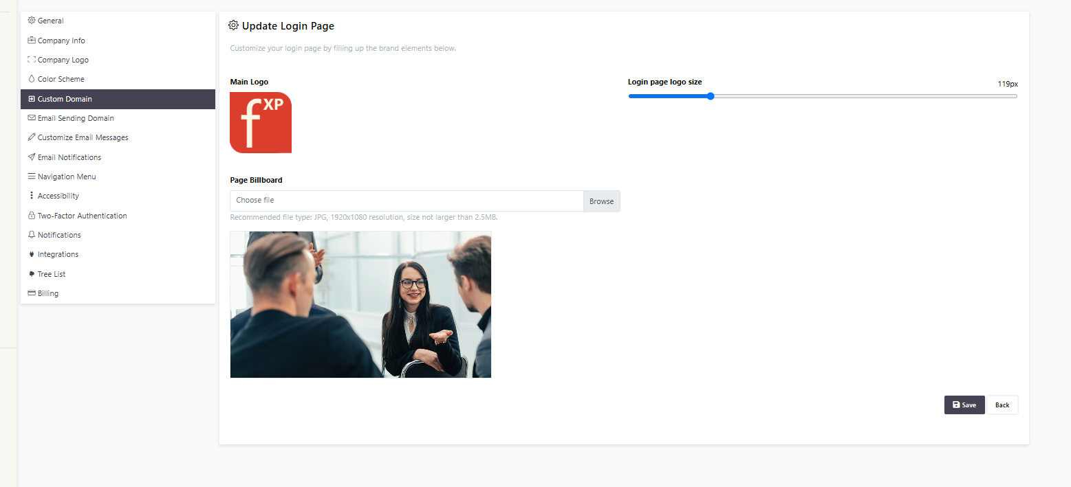 Updated Oct. 30, 2025 by SupportThe Custom Domain feature allows you to use your own company domain name on the platform, while the Custom Login Page lets you apply your branding and integrate the login experience directly into your website.